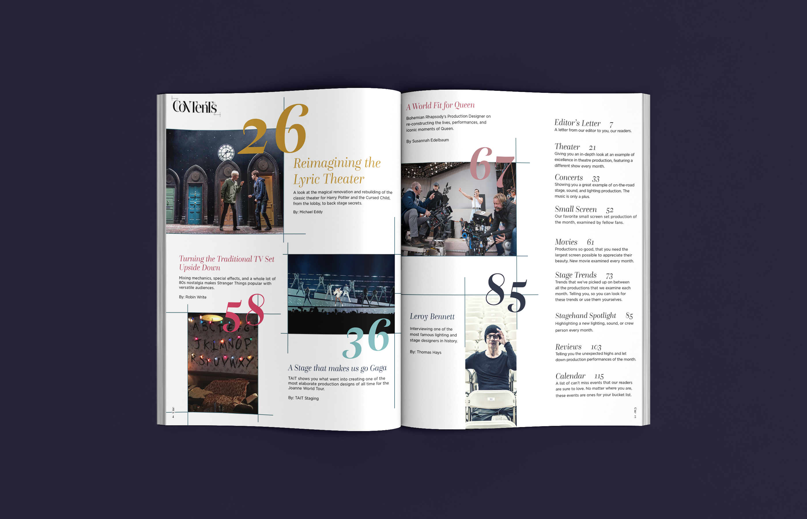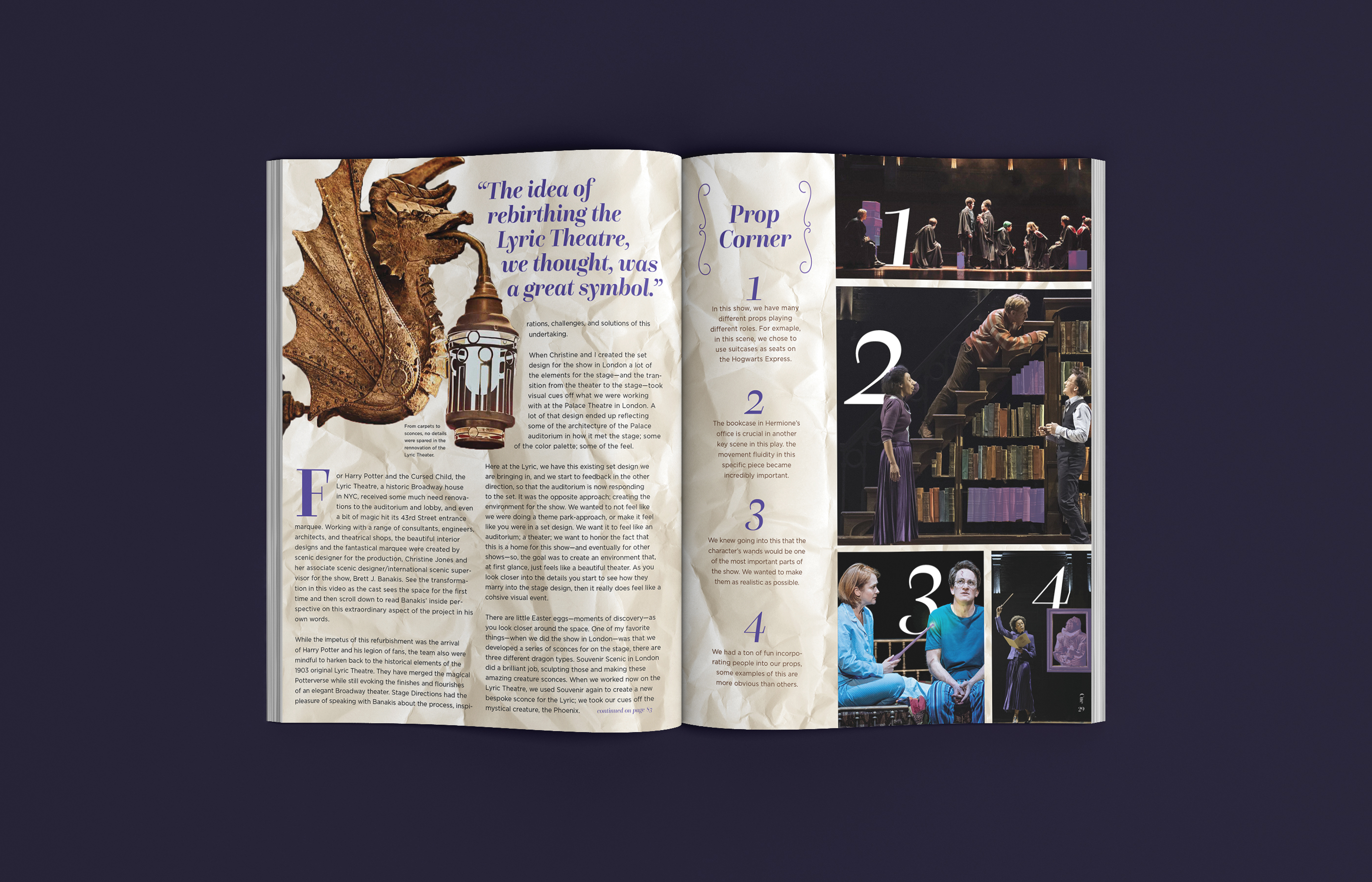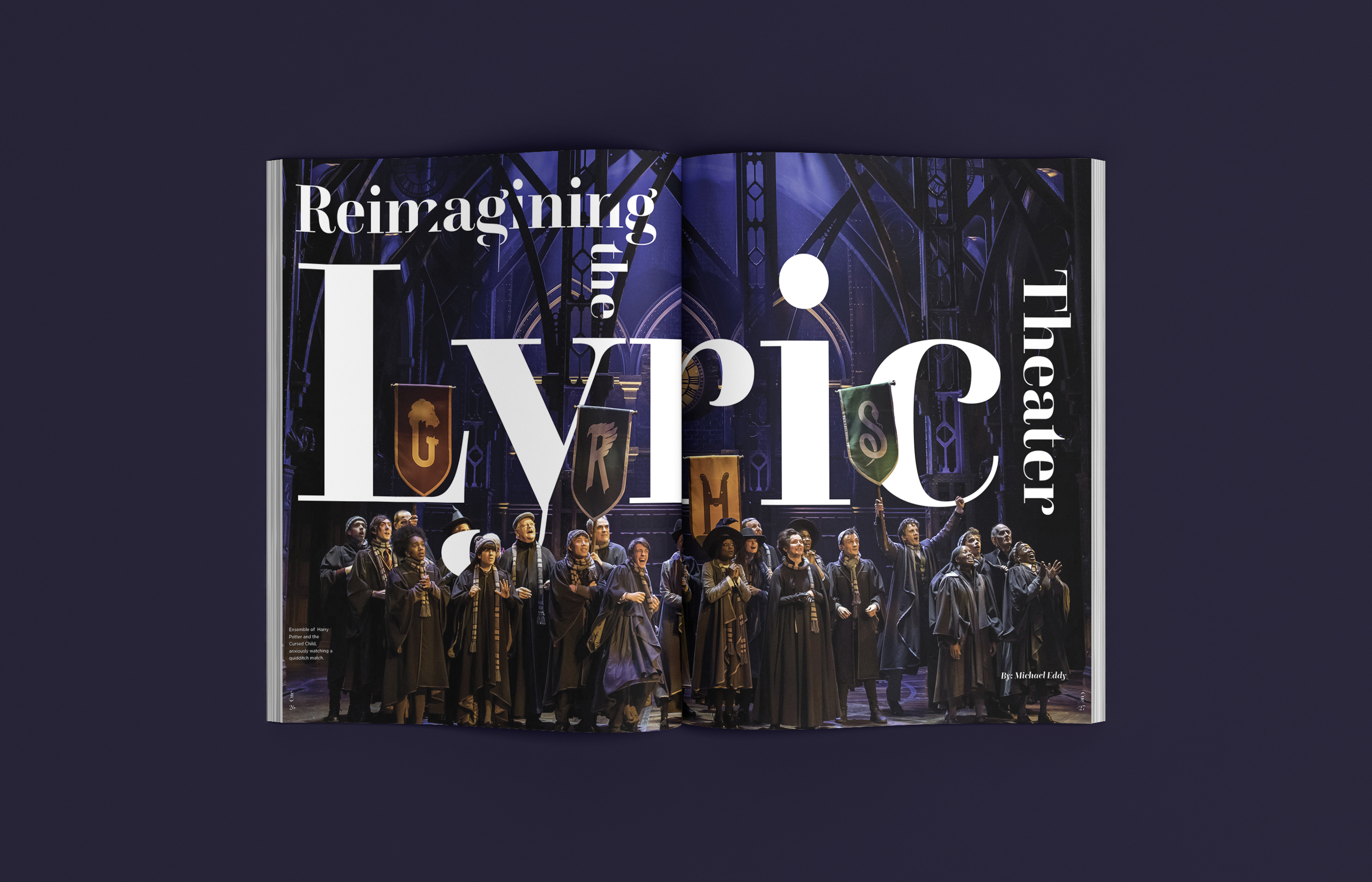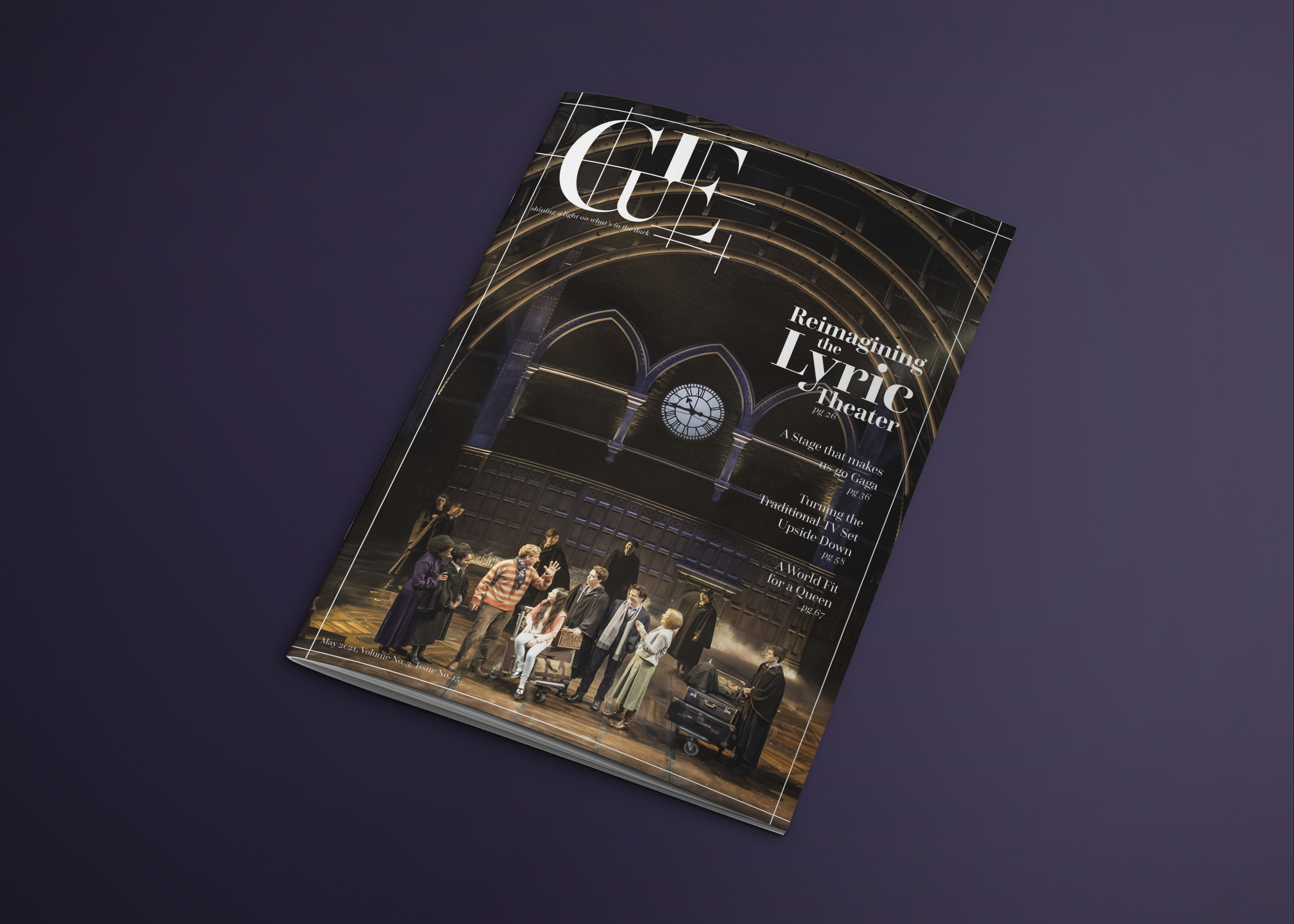 Shining a light on what's in the dark, Cue Magazine is a monthly publication that recognizes outstanding productions in theater, TV, movies, and concerts. Each issue details the dedication that goes into making a stellar production, from set design, to lighting, to special effects. The feature of this issue is all about the major renovation of the Lyric Theater for the Broadway production of Harry Potter and the Cursed Child. Bold and geometric type treatment, and line intersections incorporated throughout the issue play off of the technical work of the theater world.