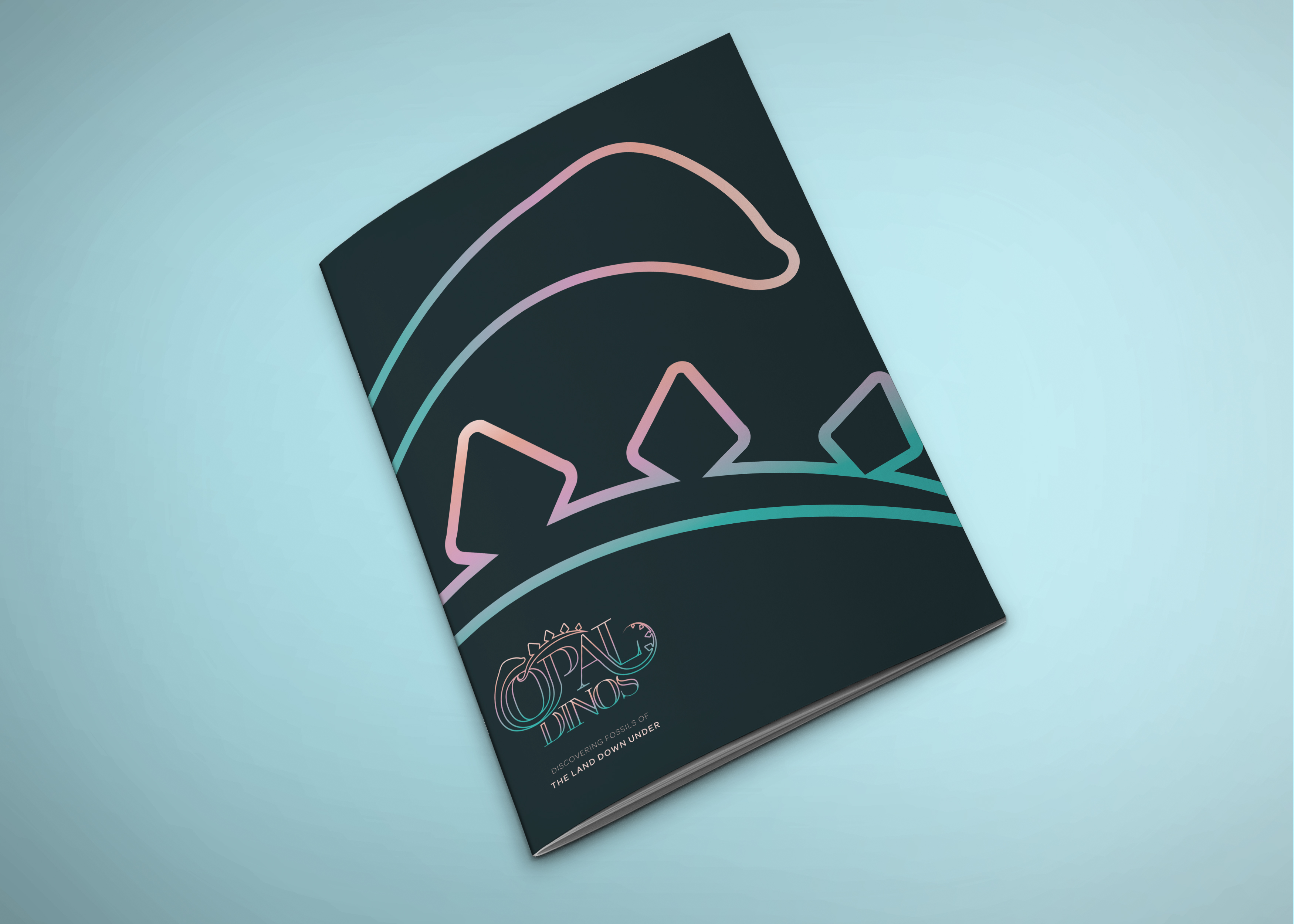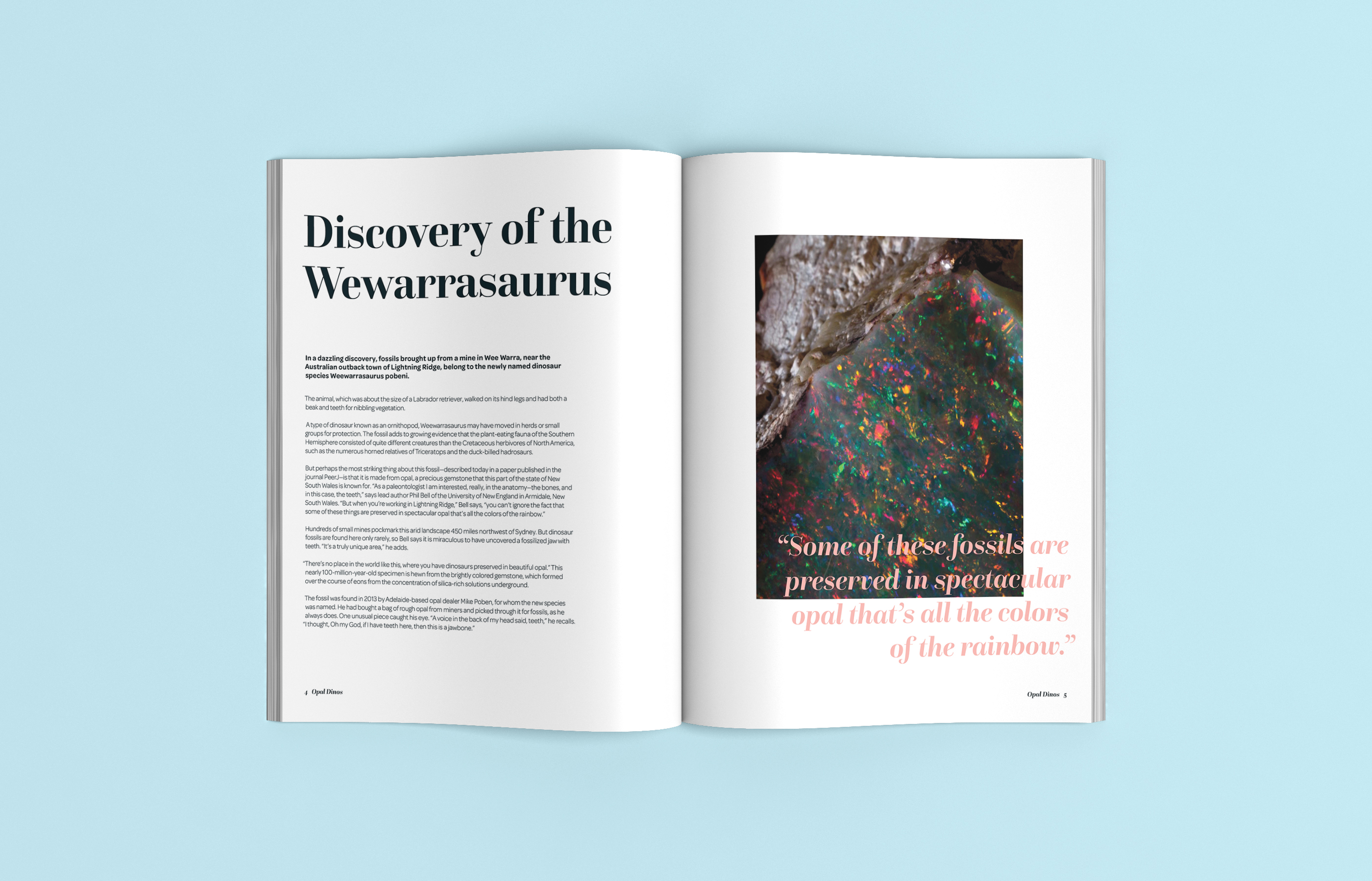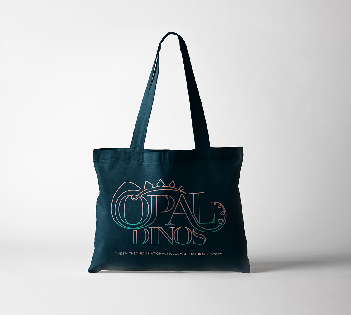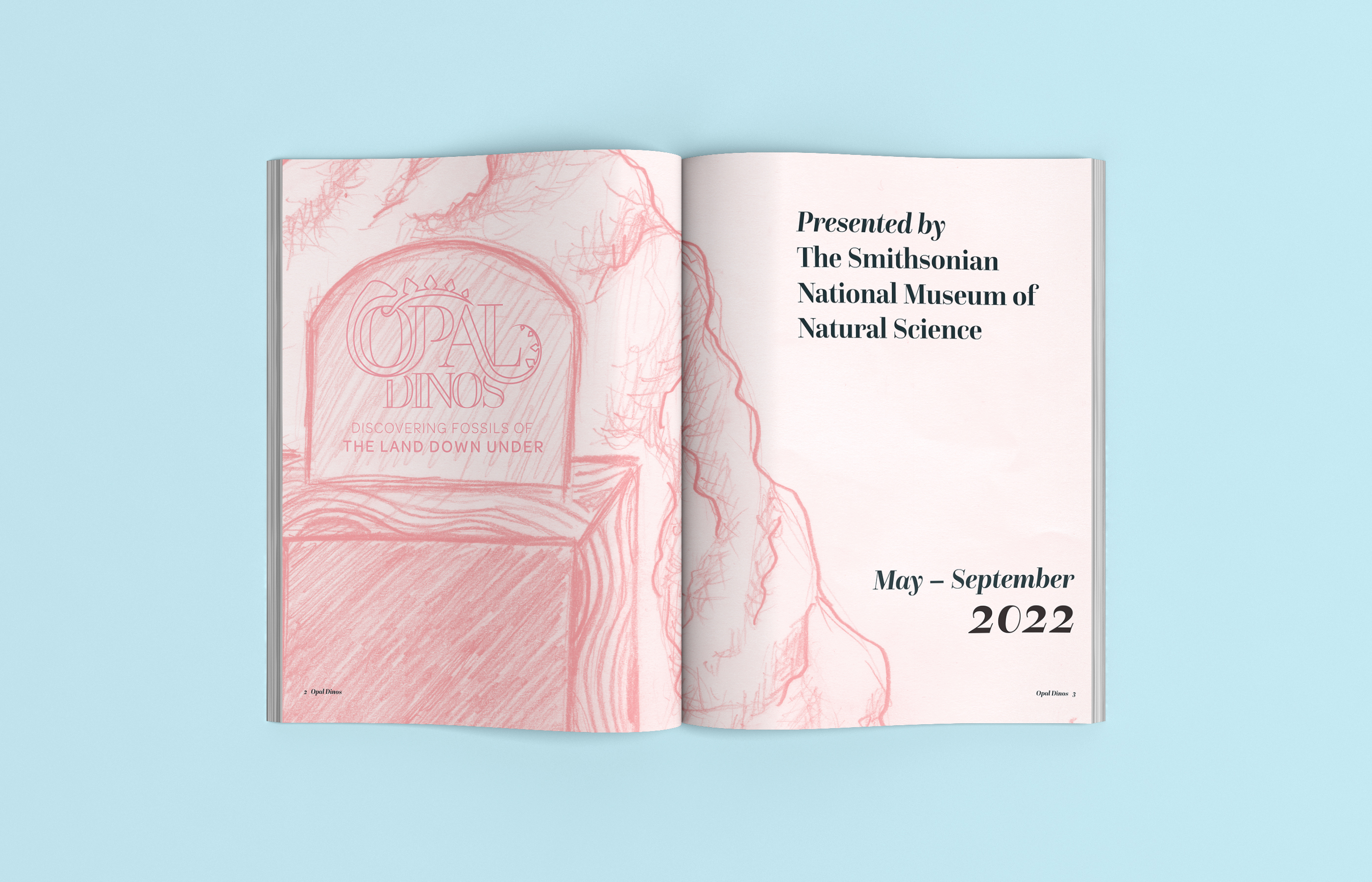 Lightning Ridge Mine in New South Wales, Australia is home to some of the most dazzling scientific discoveries in the world, opalized dinosaur fossils. Opal Dinos is an exhibition at The Smithsonian National Museum of Natural History that showcases the rare prehistoric gems and teaches audiences about their formation. The exhibition logo was thoughtfully created with custom altered typography, made to mimic the formation of opalized fossils. The elements of the brand are carried throughout the exhibition catalogue, including type treatment, color choices and custom illustrations.