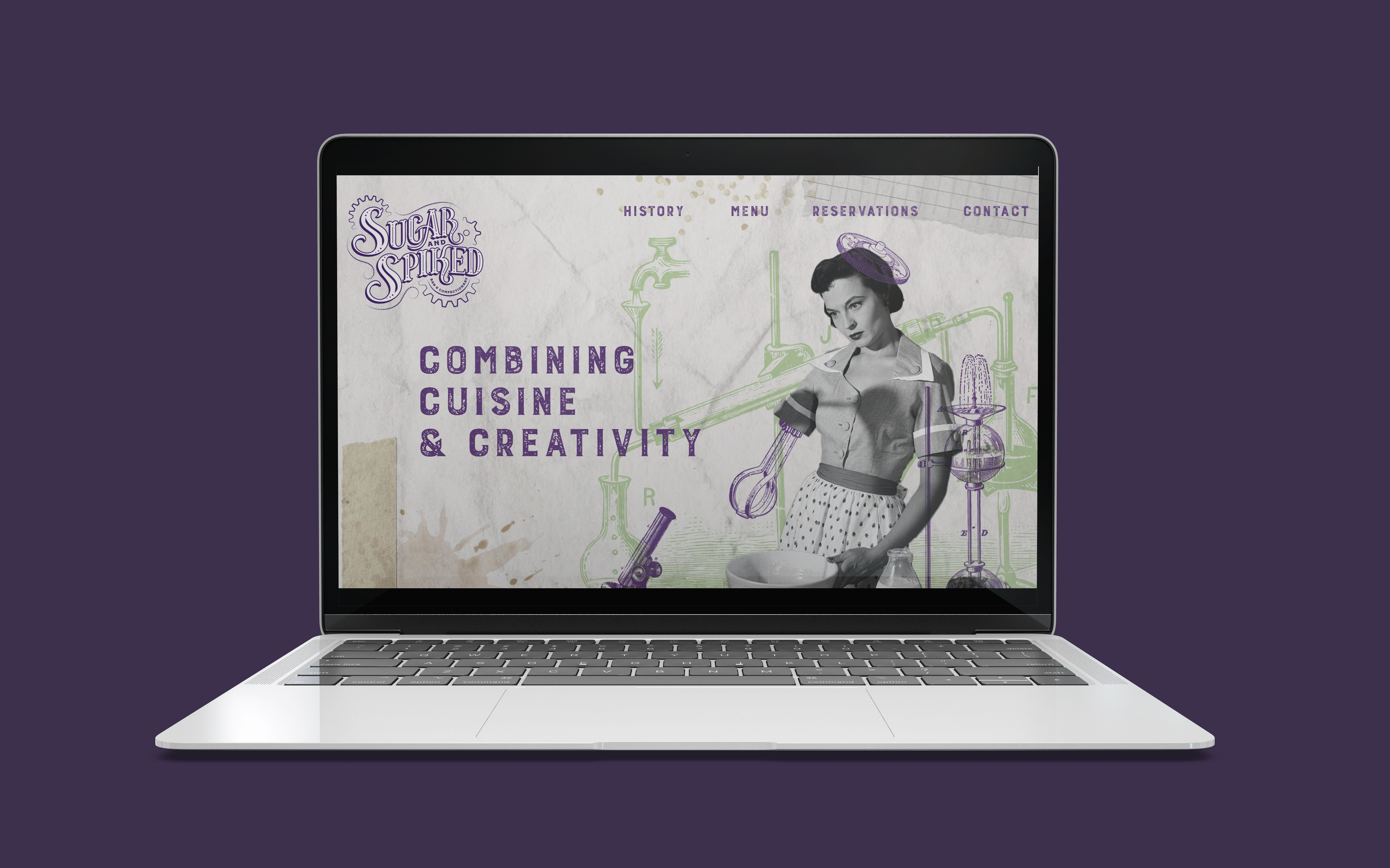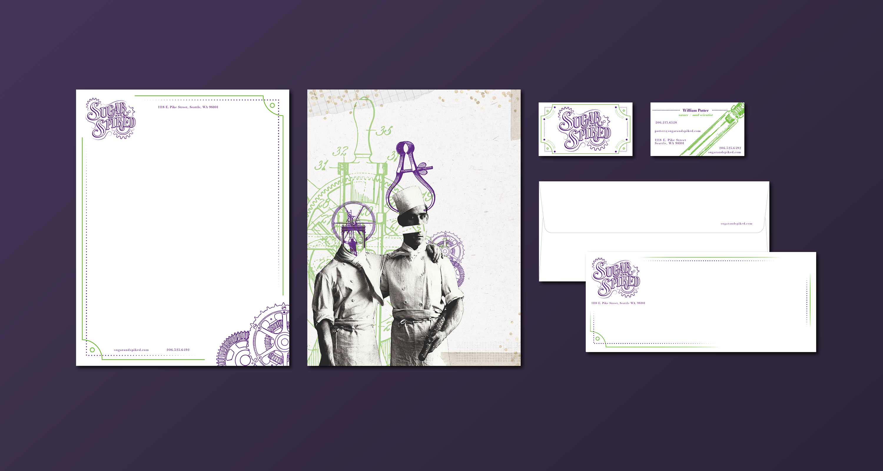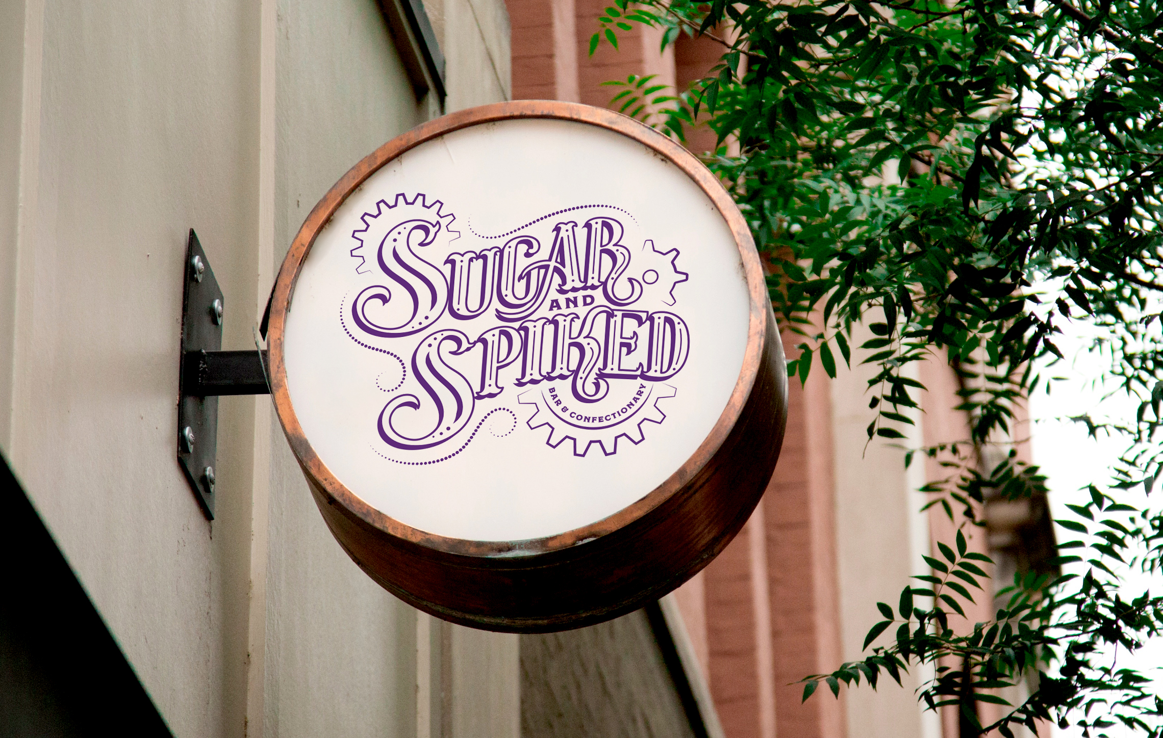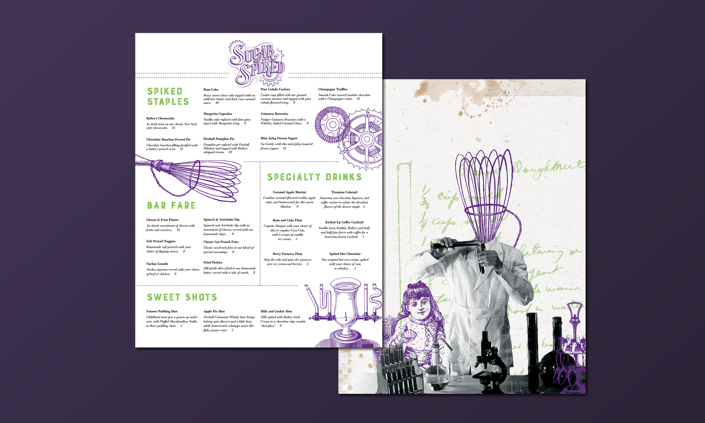 Specializing in unique and over the top alcoholic desserts is what Sugar and Spiked does best. This bar and confectionary opened their doors in 2010 and focuses on experimenting with new and unconventional pairings to create delectable combinations. The Sugar and Spiked logo was created with hand drawn typography and vector illustrations. All collages were created using vintage black and white images, scanned paper textures, and altered public domain etchings.